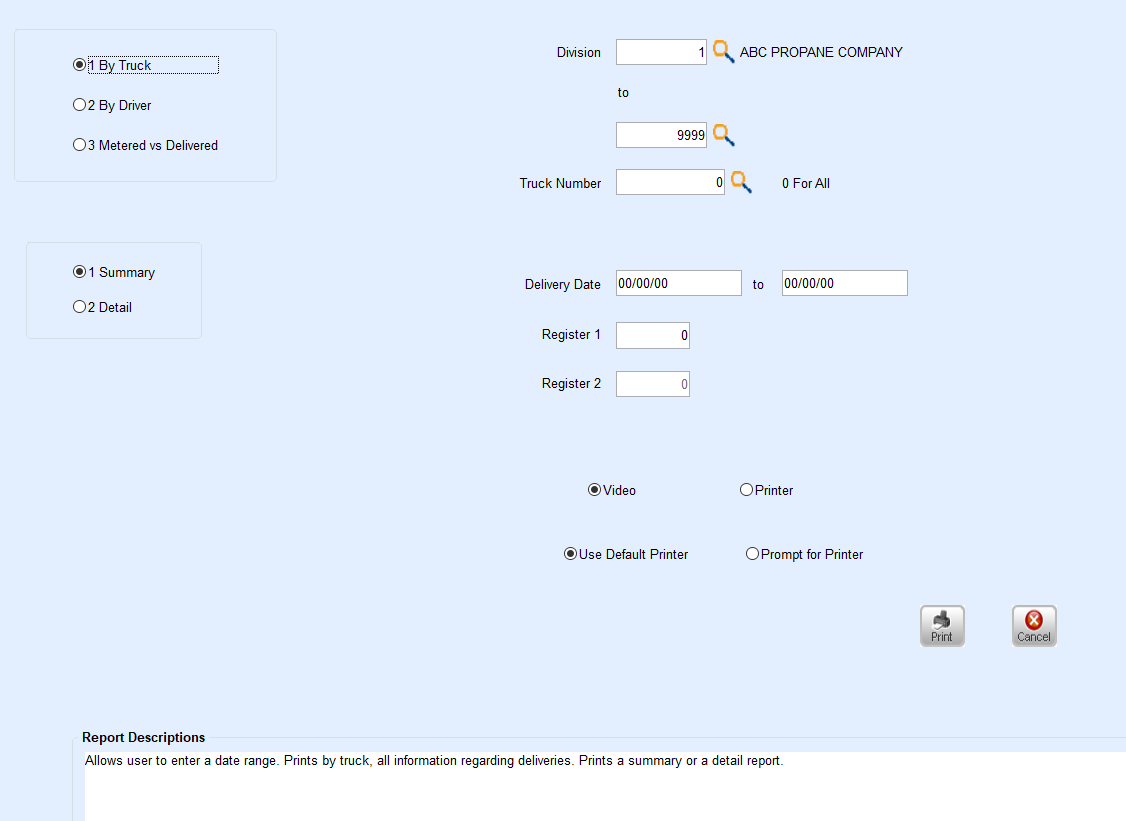 Enter a specific truck (or 0 for all) along with a date range, Register #, and print all information regarding deliveries.