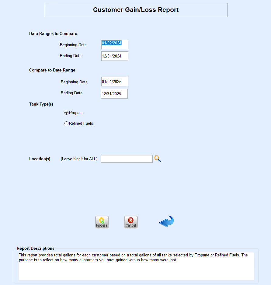 The purpose of this report is to reflect how many customers have been gained compared to how many customers have been lost for the given time frame. This report provides total gallons for each customer based on total gallons of all tanks selected by Propane or Refined Fuels.