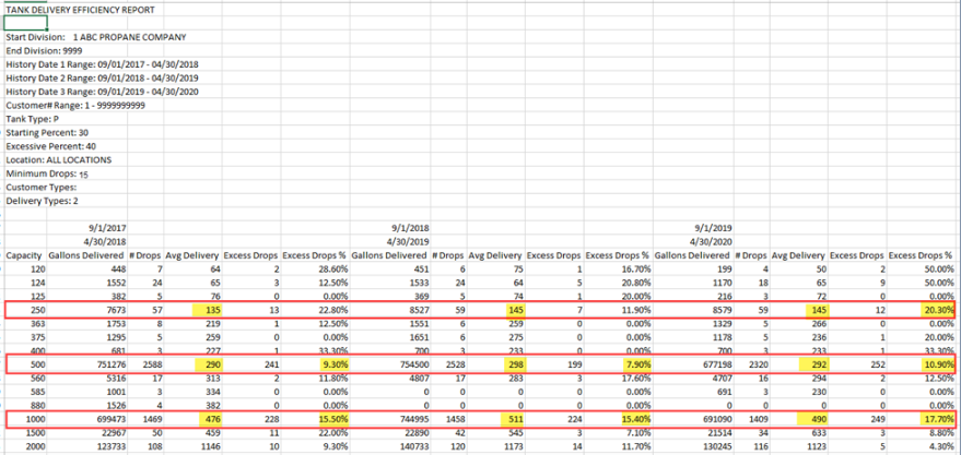 It is recommended the date ranges be based on the heating season as summer fill deliveries may skew the data since summer fills are not typically a full drop size. This report can also be processed to report on a specific customer.