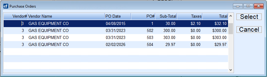 If searching for a specific PO, select Find on the PO screen. Search by Vendor, date range, Purchase Order#, or Total Amount.