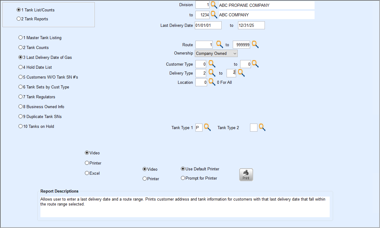 An example of running this report would be to process for company-owned tanks that show a last delivery date from three years ago. If a company has not delivered to this tank in over 3 years: