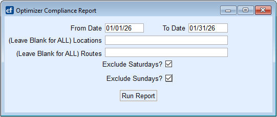 This report is processed by a date range for all OptimizerPlus+ routes and drivers. For the most accurate values, it is best to exclude Saturday and Sunday unless drivers actively deliver on those days. This report automatically opens in excel and auto-saves to the CSV folder located within the Energy Force data folder structure.