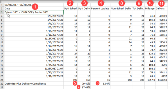 - Percent Update – This is the number of percent updates against the OptimizerPlus+ Route (compliant delivery).