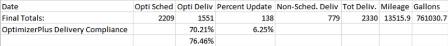 - Opti Sched OptimizerPlus+ Delivery Compliance – This is the compliancy percent for OptimizerPlus+ delivered gallons.