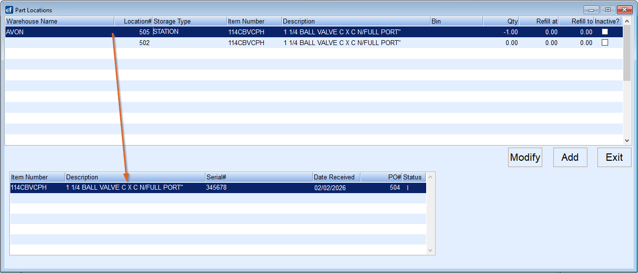 - Available serial numbers will be listed per location and indicate the PO# and Date Received.