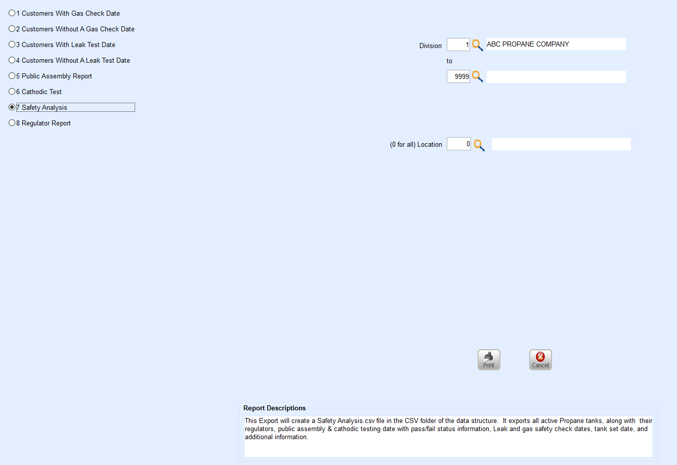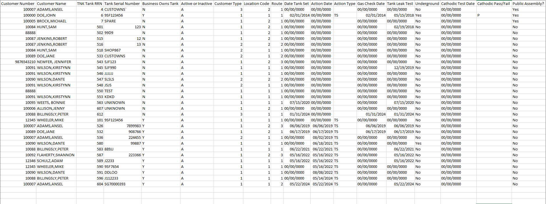 The Safety Analysis report exports to Excel and displays each tank associated to a customer along with leak test dates, regulator information, public assembly tanks, Cathodic tank testing, and pass/fail status. The report can be processed for a specific division or tank location.