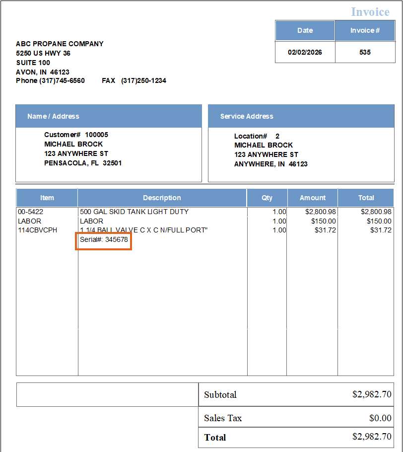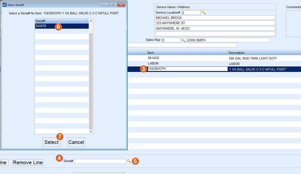 - Choose Select. The Select Serial# window will close, returning to the Invoice screen. The serial number associated to the inventory item will now display.