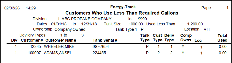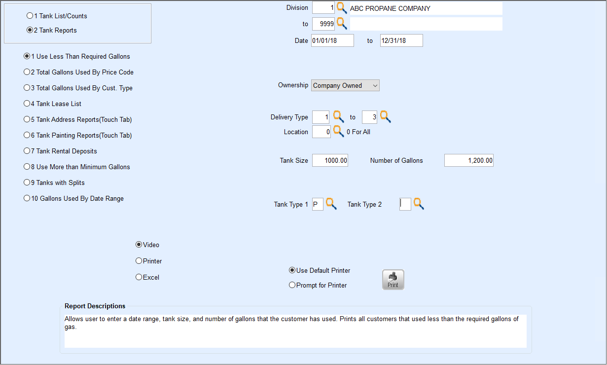 This gives the ability to enter a date range, tank size, and number of gallons required for delivery during a specified time frame. Running this report helps determine if a customer tank should be switched out to a smaller tank.